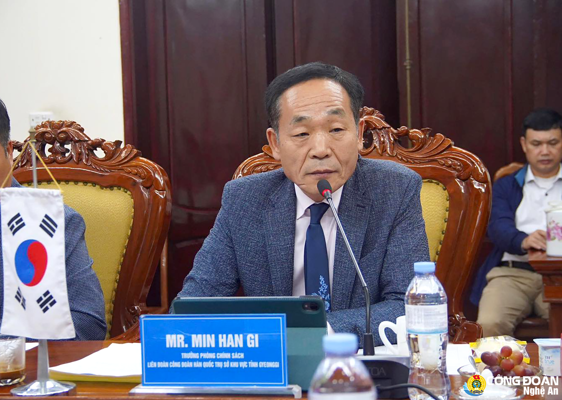 Dự buổi làm việc có ông Kha Văn Tám – Ủy viên Ban Chấp hành Tổng Liên đoàn Lao động Việt Nam, Tỉnh ủy viên, Phó Chủ tịch Ủy ban MTTQ Việt Nam tỉnh, Chủ tịch Liên đoàn Lao động tỉnh Nghệ An; ông Nguyễn Chí Công – Phó Chủ tịch Liên đoàn Lao động tỉnh; đại diện Ban Tuyên giáo - Dân vận Tỉnh ủy; ông Min Han Gi – Trưởng phòng Hành chính, Liên đoàn Công đoàn Hàn Quốc khu vực tỉnh Gyeonggi cùng các thành viên trong đoàn.