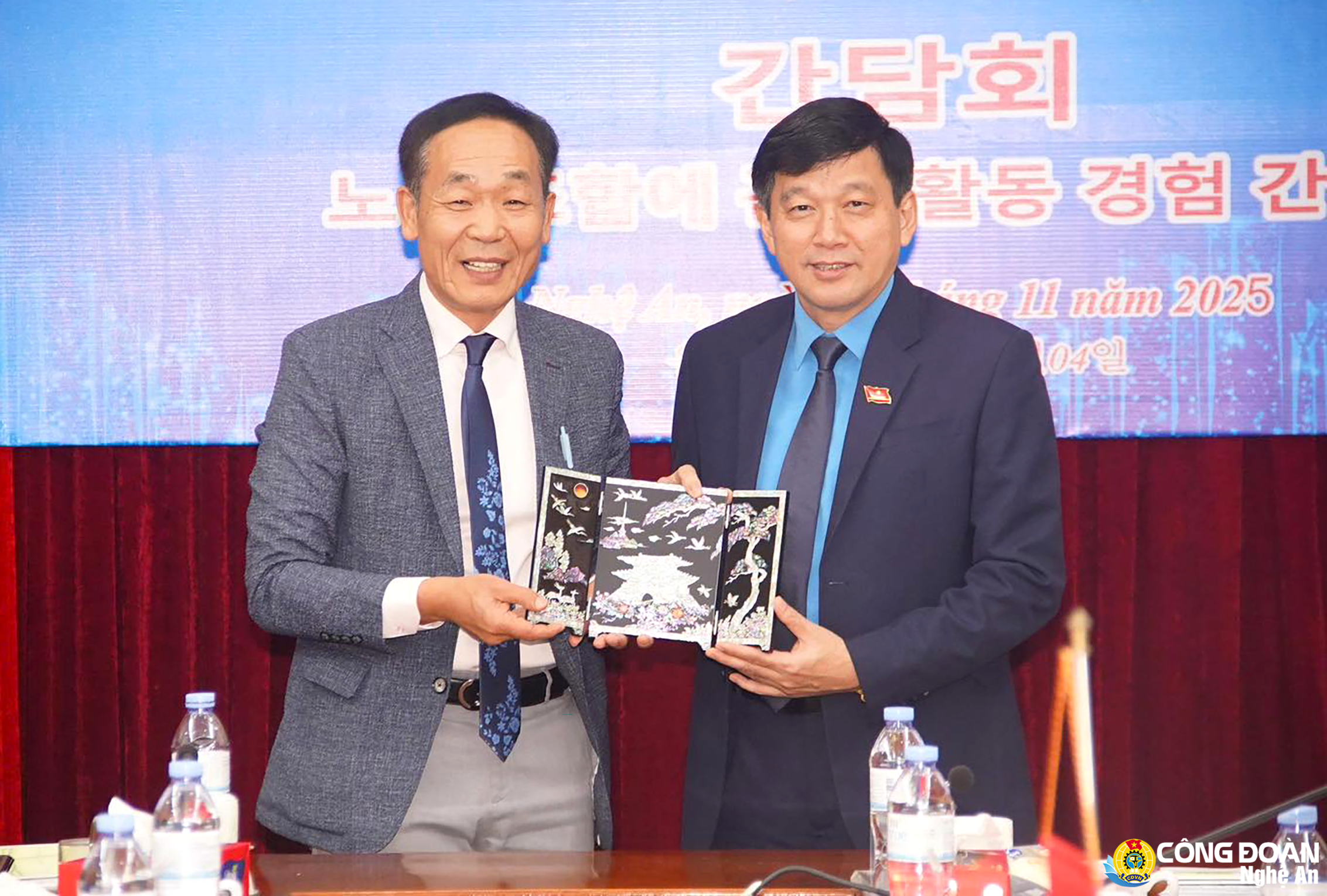 Đại diện lãnh đạo phía Hàn Quốc trao quà lưu niệm cho đồng chí Kha Văn Tám - Chủ tịch Liên đoàn Lao động tỉnh (bên phải)