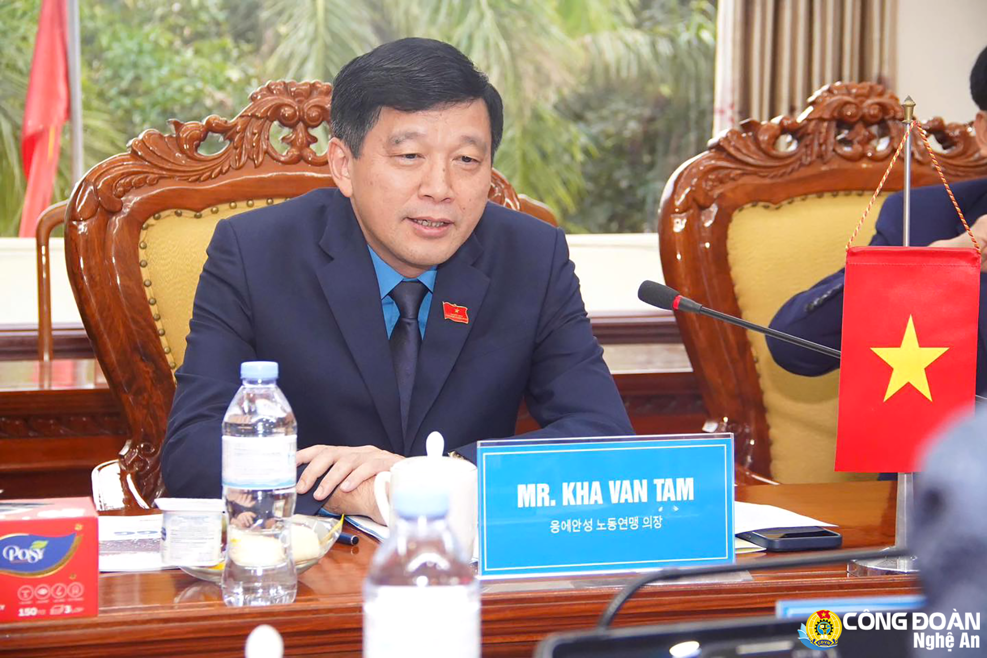 Phát biểu chào mừng, ông Kha Văn Tám bày tỏ niềm vui mừng được đón tiếp đoàn đại biểu đến thăm và trao đổi kinh nghiệm công tác. Đồng chí gửi lời chúc sức khỏe, hạnh phúc tới các thành viên trong đoàn và tin tưởng rằng chuyến thăm sẽ góp phần tăng cường tình hữu nghị, hợp tác giữa hai tổ chức công đoàn cũng như giữa hai tỉnh Nghệ An – Gyeonggi.