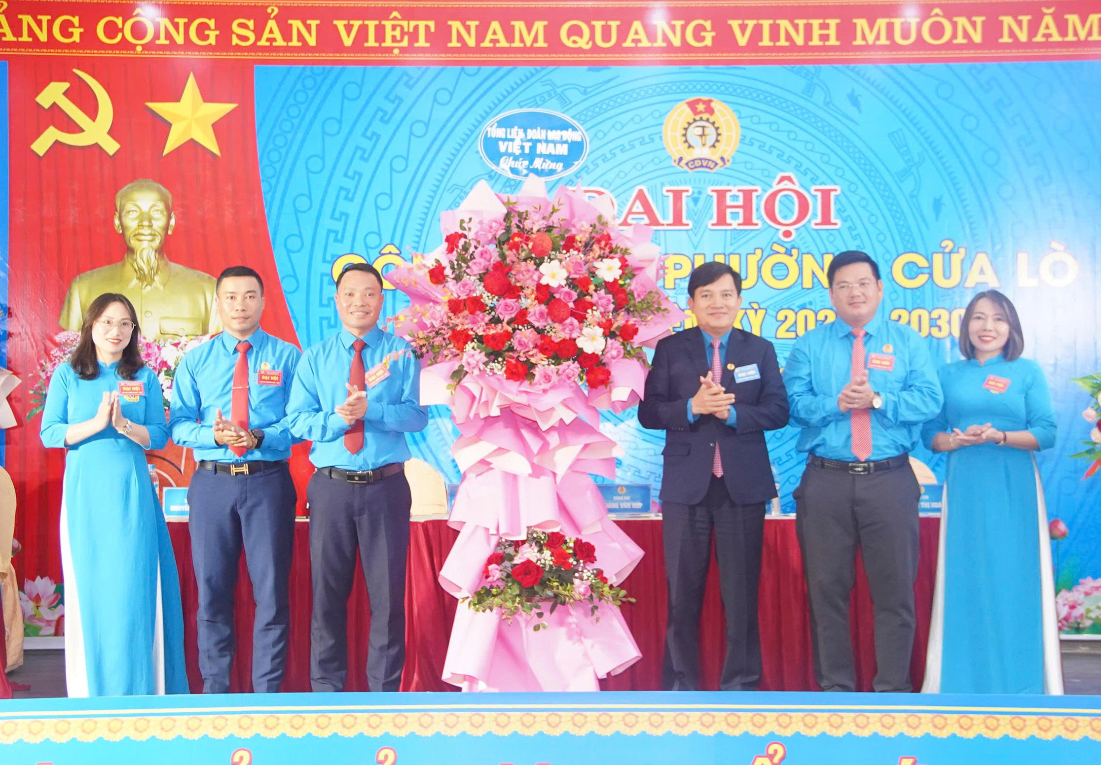 Đại diện lãnh đạo Tổng Liên đoàn, Liên đoàn Lao động tỉnh, Đảng uỷ phường trao hoa chúc mừng Ban chấp hành Công đoàn phường Cửa Lò