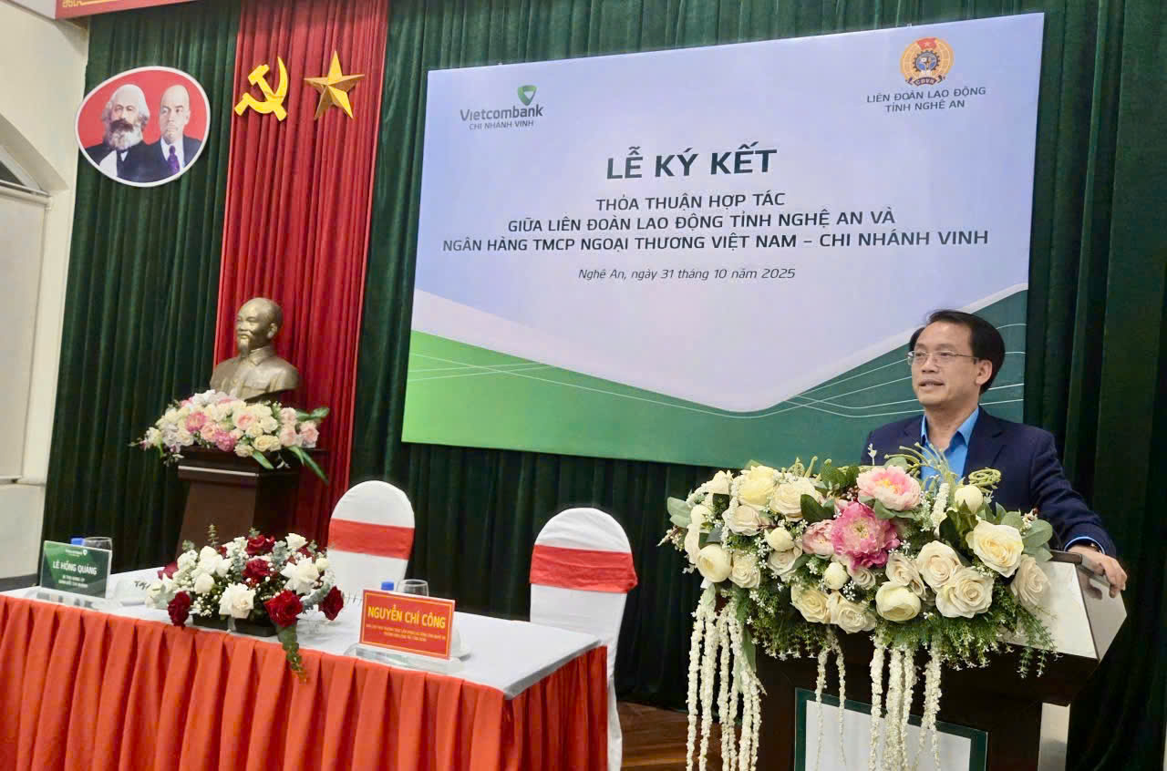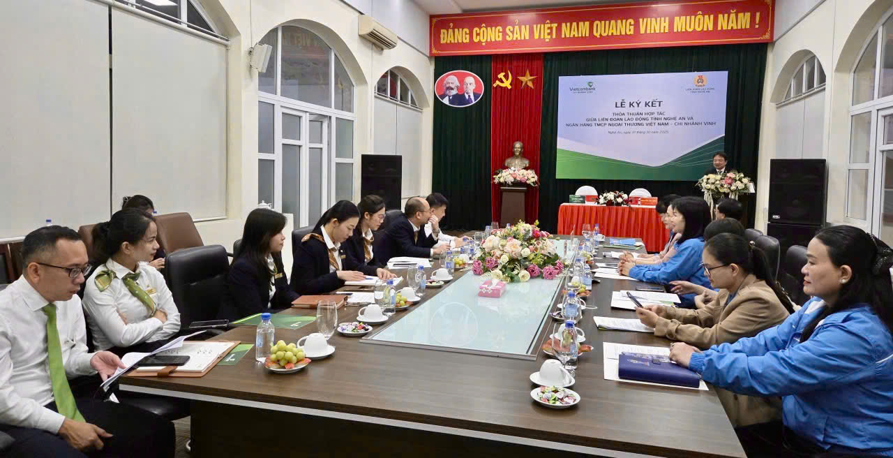 Chiều ngày 31/10/2025, Liên đoàn Lao động tỉnh Nghệ An tổ chức Lễ ký kết thỏa thuận hợp tác với Ngân hàng TMCP Ngoại thương Việt Nam (Vietcombank) Chi nhánh Vinh.
