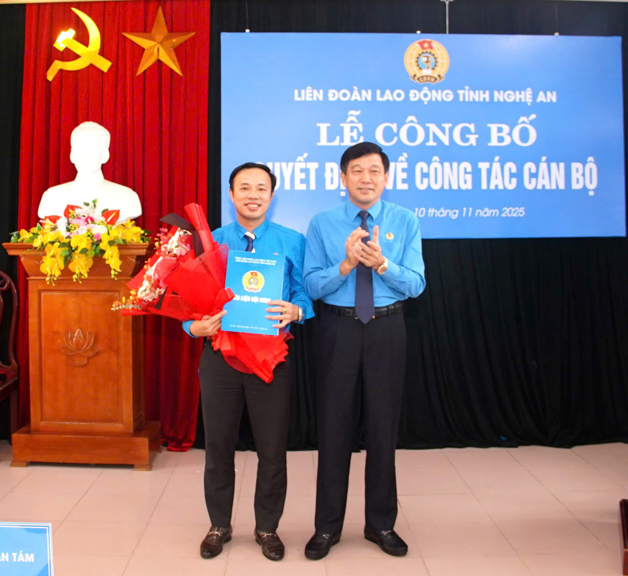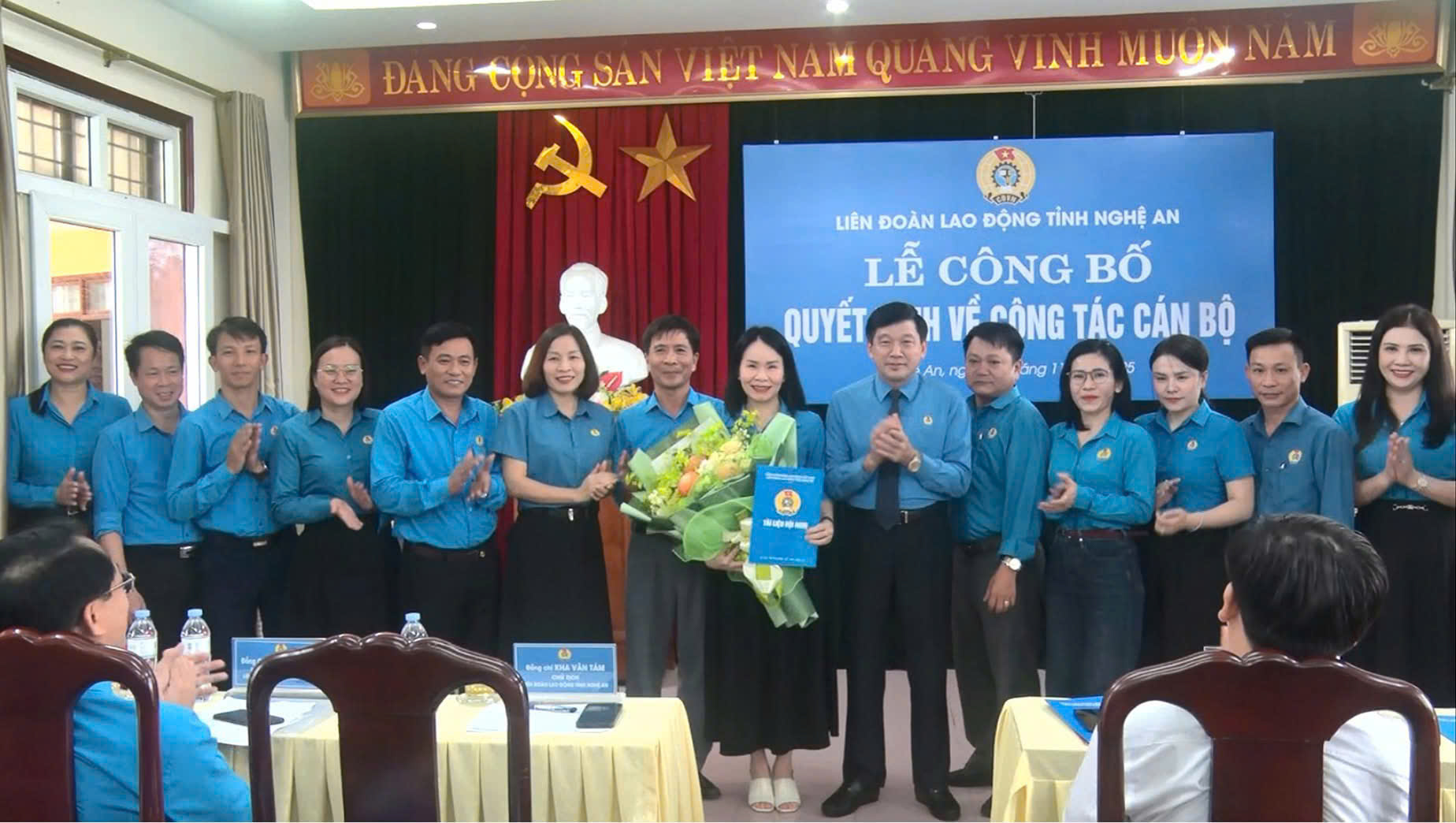 Tại buổi lễ, LĐLĐ tỉnh đã công bố các quyết định chỉ định đồng chí Cao Nguyên Hùng – Phó giám đốc Trung tâm Xúc tiến Đầu tư, Thương mại và Du lịch tỉnh Nghệ An – được chỉ định giữ chức danh Phó Chủ tịch LĐLĐ tỉnh Nghệ An. Đồng thời, công bố quyết đỉnh chị đỉnh bổ sung 14 đồng chí Ủy viên Ban chấp hành LĐLĐ tỉnh Nghệ An, nhiệm kỳ 2023-2028.