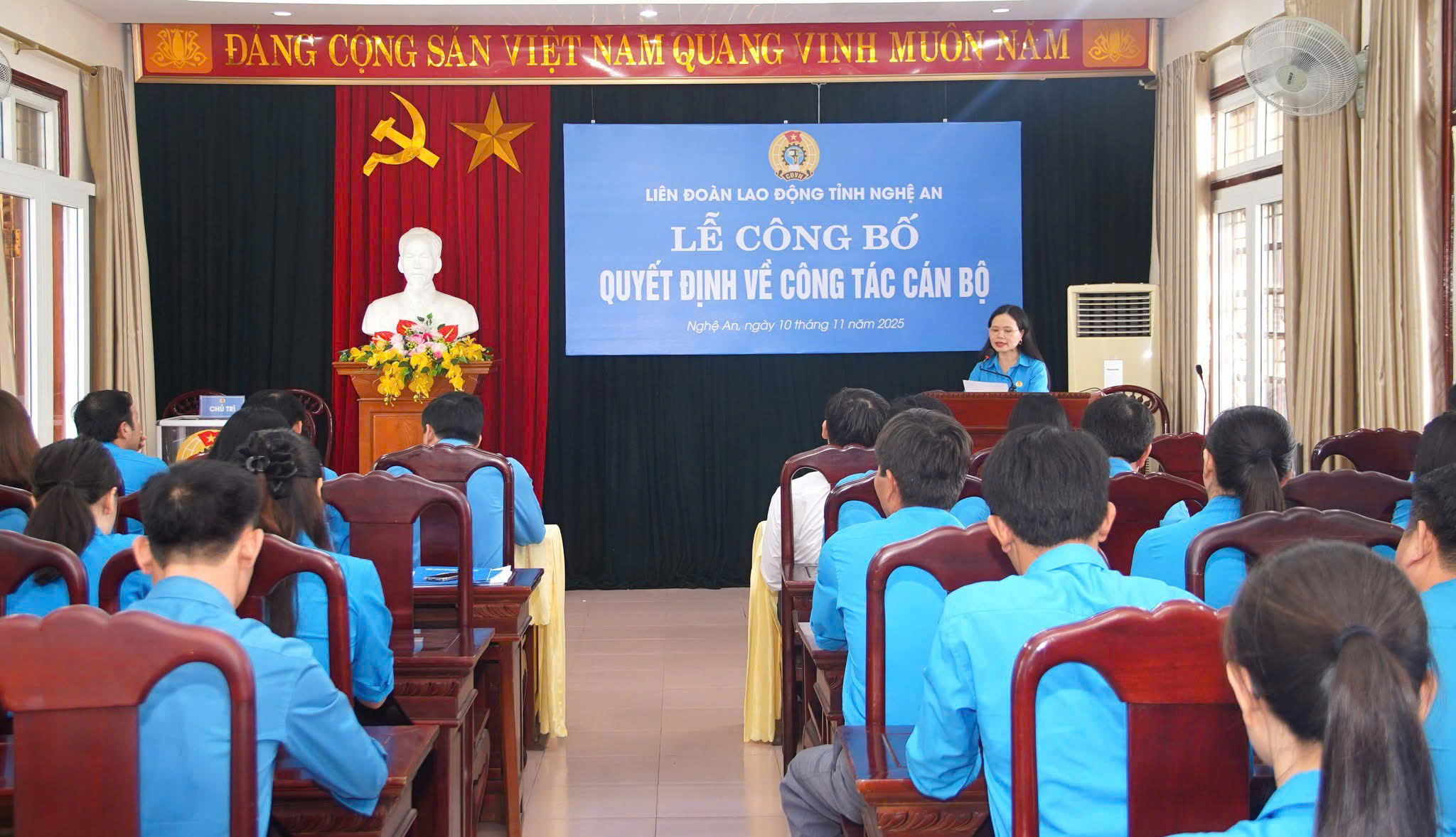 Ngày 10/11/2025, Liên đoàn Lao động tỉnh tổ chức lễ công bố các quyết định về công tác cán bộ. Tham dự buổi lễ có đồng chí Kha Văn Tám - Ủy viên Ban Chấp hành Tổng LĐLĐ Việt nam, Ủy viên Ban chấp hành Đảng bộ tỉnh, Phó Chủ tịch Ủy ban MTTQ Việt Nam tỉnh, Chủ tịch LĐLĐ tỉnh; đồng chí Ngô Sỹ Nguyệt – Phó Trưởng ban Tổ chức Tỉnh ủy; đồng chí Trần Thị Thu Hương - Phó Chủ tịch Ủy ban MTTQ Việt Nam tỉnh.
