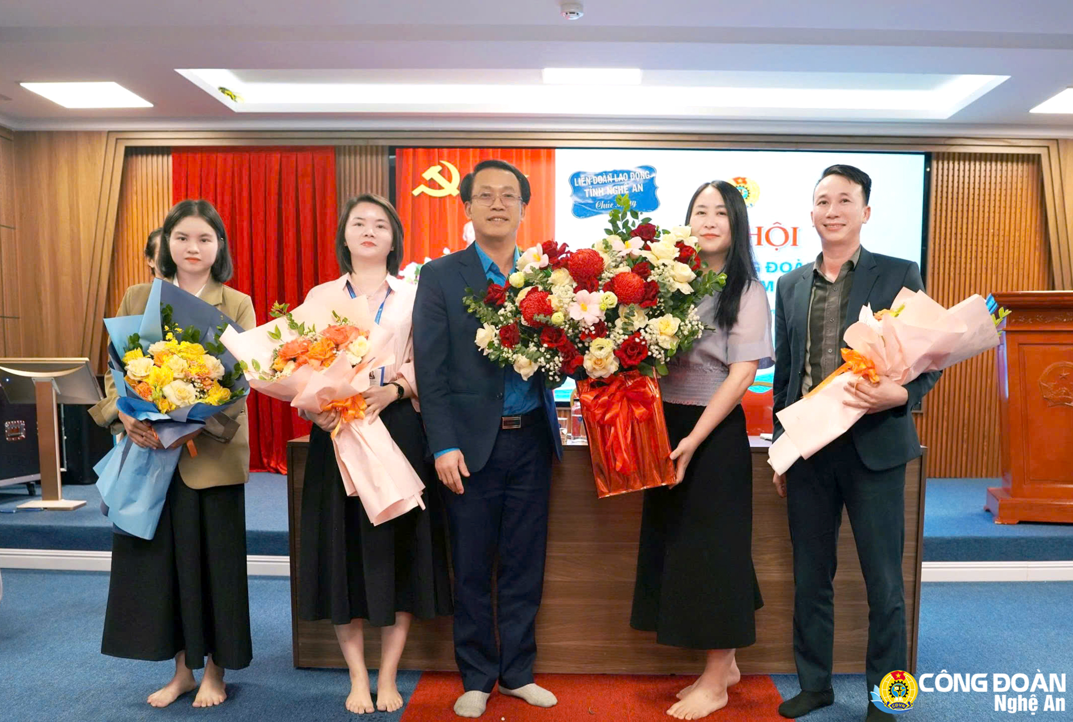 Đồng chí Nguyễn Chí Công - Phó Chủ tịch Liên đoàn lao động tỉnh trao hoa chúc mừng Ban chấp hành Công đoàn cơ sở Bệnh viện Răng hàm mặt Nghệ An