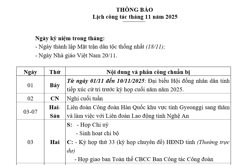| 17 | Sáu | S: - Phối hợp với Sở Giáo dục đào tạo và Hội Liên hiệp Phụ nữ tỉnh Nghệ An tổ chức Hội nghị biểu dương “Nữ giáo viên tiêu biểu vượt khó” năm 2023 (Ban TG - NC chuẩn bị.) - Thăm, chúc mừng các cơ sở giáo dục kỷ niệm 41 năm ngày Nhà giáo Việt Nam. C: - Phát động cuộc thi trực tuyến “Tìm hiểu Nghị quyết Đại hội Công đoàn tỉnh Nghệ An lần thứ XIX, nhiệm kỳ 2023-2028”. - Gặp mặt giảng viên kiêm chức Liên đoàn Lao động tỉnh nhân ngày Nhà giáo Việt Nam (Ban Tổ chức chuẩn bị). |